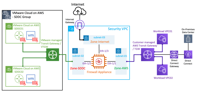 With the latest "Transit VPC" feature in the VMware Cloud on AWS (VMC) 1.12 release, you can now inject static routes in the VMware managed Transit Gateway (or VTGW) to forward SDDC egress traffic to a 3rd-party firewall appliance for security inspection. The firewall appliance is deployed in a Security/Transit VPC to provide transit routing … Continue reading Integrating a 3rd-party firewall appliance with VMware Cloud on AWS by leveraging a Security/Transit VPC
