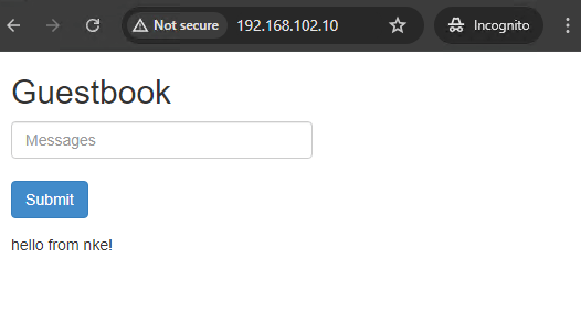 Open a browser page and hit that LB IP address, and you should see the Guestbook application delivered from our NKE cluster! Leave some messages there and click submit, and the data will be stored in the Redis database.