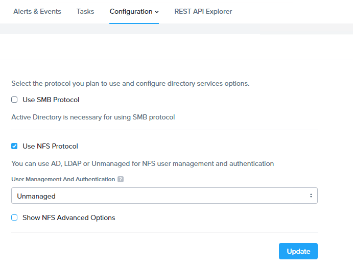 Once the filer server is provisioned, go to Configuration > Authentication to enable the NFS protocol. Since this will be consumed by NKE so for now we just leave it to “Unmanaged”.