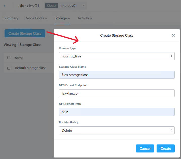 Parameters: nfsPath=/k8s,nfsServer=fs.vxlan.co,storageType=NutanixFiles