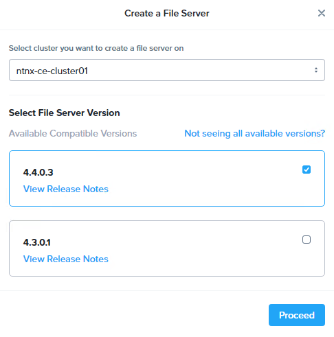 To do so, first we’ll need to deploy a Nutanix Filer Server. In Prism Central, go to Unified Storage > Files > Filer Server, then click New Filer Server. I will be using ver 4.4.0.3 in this case.