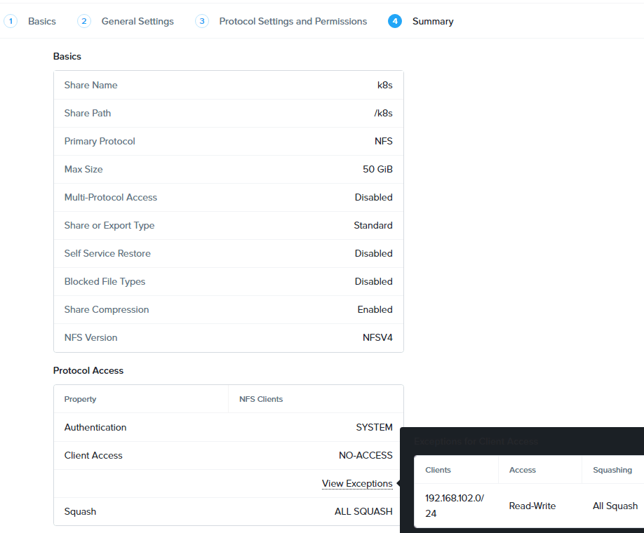 Now go to Shares & Exports to create a NFS share (for the NKE storage class). Provide a share name, specify size and select Protocol (NFS is pre-selected since we only enabled it). In General Settings page, leave the default (Enable Compression) and select next.
