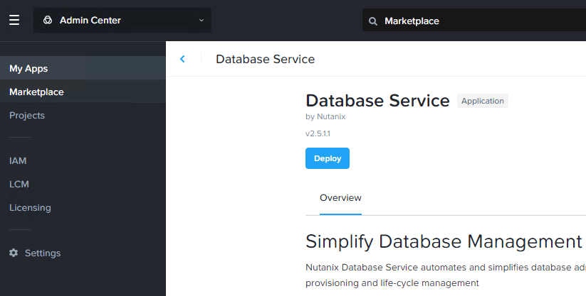 To begin, log into your Prism Central and navigate to Admin Center > Marketplace, and deploy the “Database Service”.