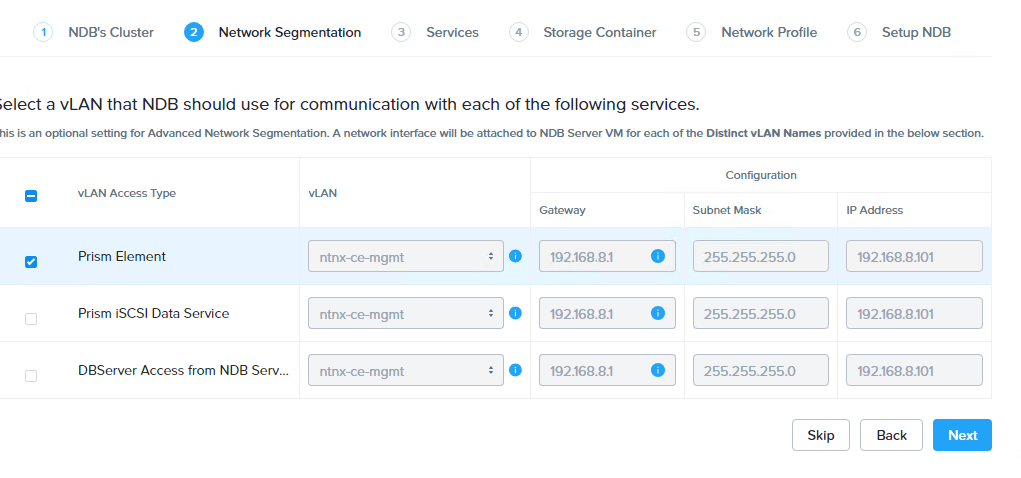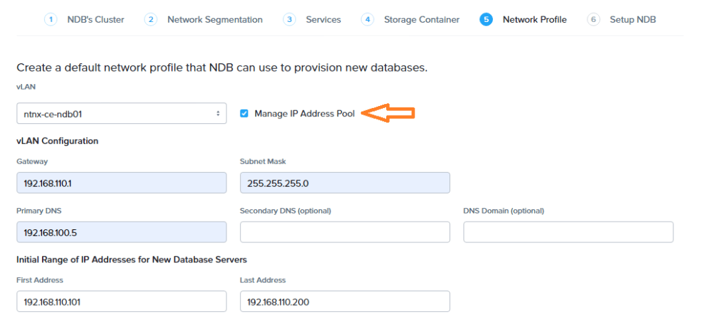 For the Network Profile, it is recommended you have a sperate and dedicated VLAN for database provisioning, and the address pool should be managed by NDB (instead of IPAM).