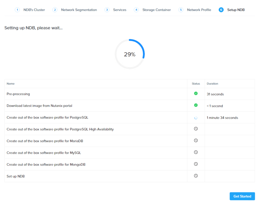 That’s pretty much all you need to deploy and register the NDB service. You’ll see NDB creating a bunch of database profiles to help streamline the DB provisioning process (more on this in a movement). The whole process will take approx. 10~20mins.