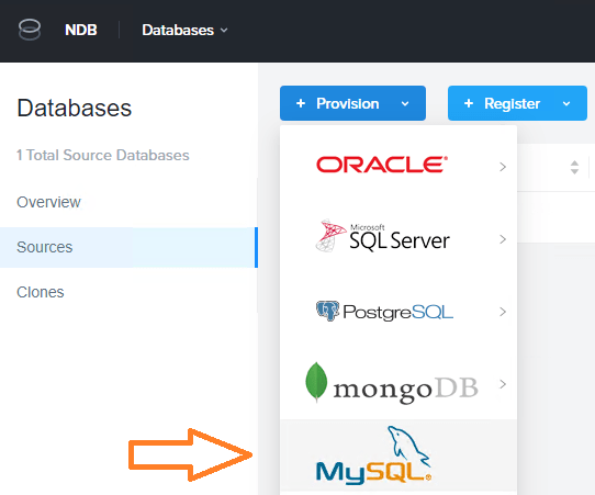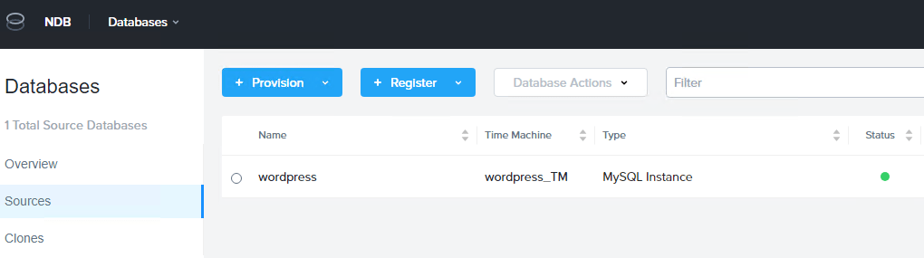 Once the NDB service is deployed and registered to your CE cluster, go to Databases > Source to provision a MySQL instance for our demo app.
