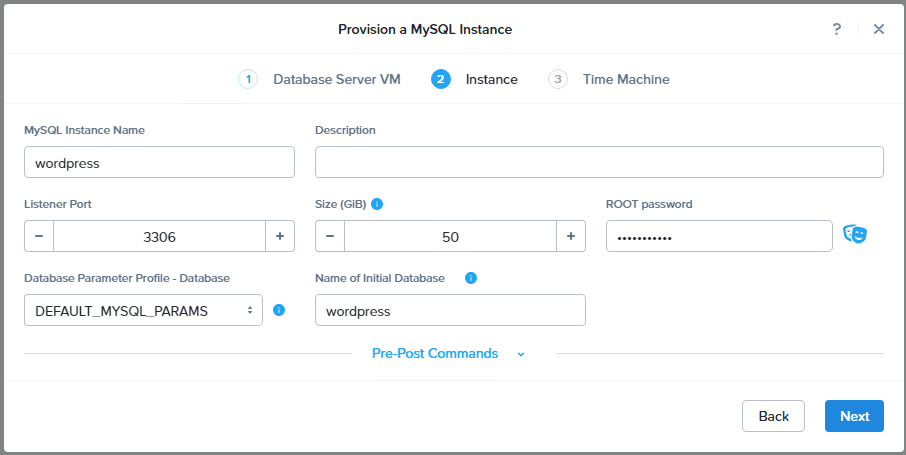 Next, you’ll define important properties such as DB name, TCP port, size etc. You can optionally attach customized pre-post scripts as well.