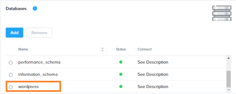 You can also verify that an initial database of “wordpress” has been created, perfect!