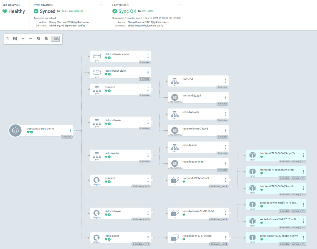 Back at the Argo CD console, we can see the app status is now fully synced, and you can easily visualize what resources (Pods, PVCs, Services etc) are getting deployed. You can also click into each individual resource to examine the details such as live manifest and logs etc.