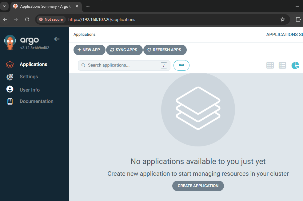 Now open a browser page and hit the LB address for argocd-server (192.168.102.20 in my case), you should be able to login using admin with the initial password. Once logged in, you can update the password under User Info > Update password.