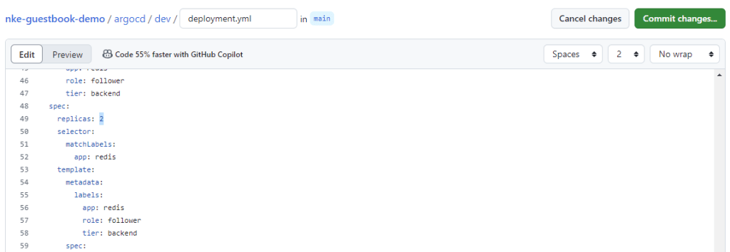 To test the automatic sync mechanism, we can make a simple change at the source repo: let’s update the Redis follower replica (from 2 to 3) and commit the change.